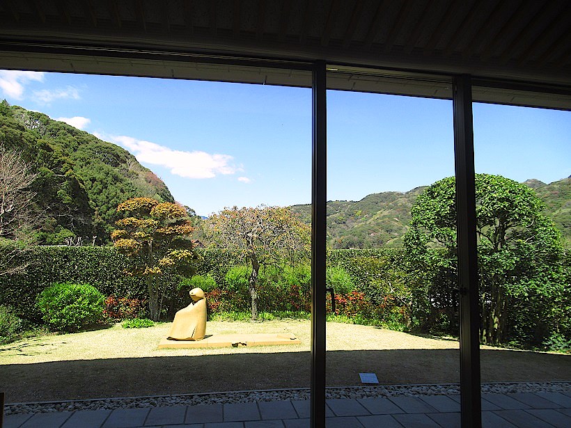 近代館のカフェコーナーで伊豆の山々を背景に